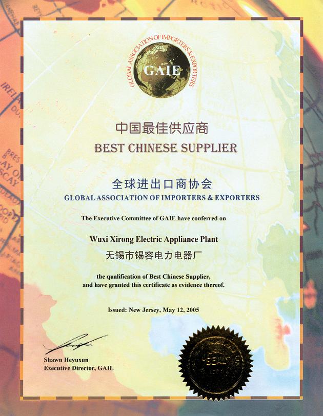 無(wú)錫市錫容電力電器有限公司,2005年,7月12號(hào)被全球進(jìn)出口商協(xié)會(huì)評(píng)為中國(guó)最佳供應(yīng)商。